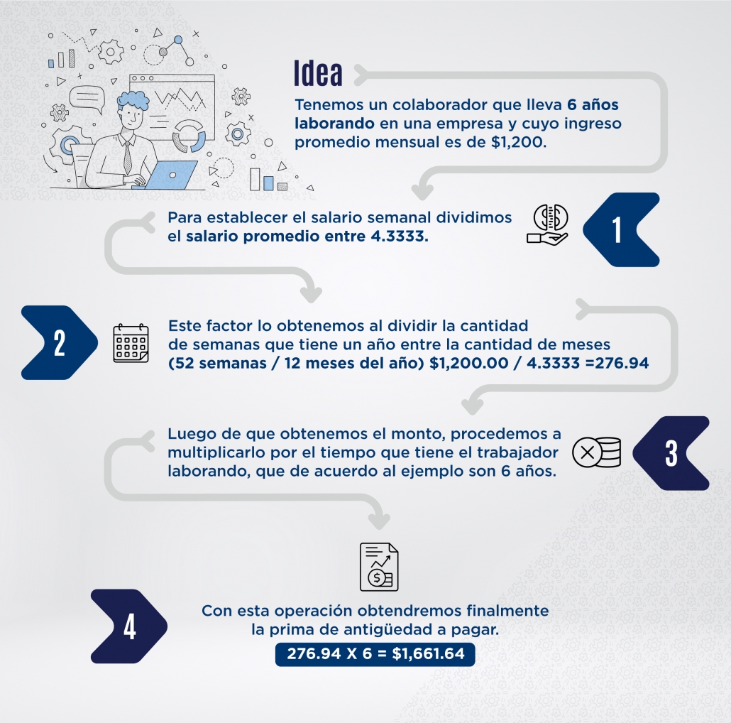 Recordemos que, el colaborador tiene derecho a una semana de salario por cada año laborado, lo que se traduce en: